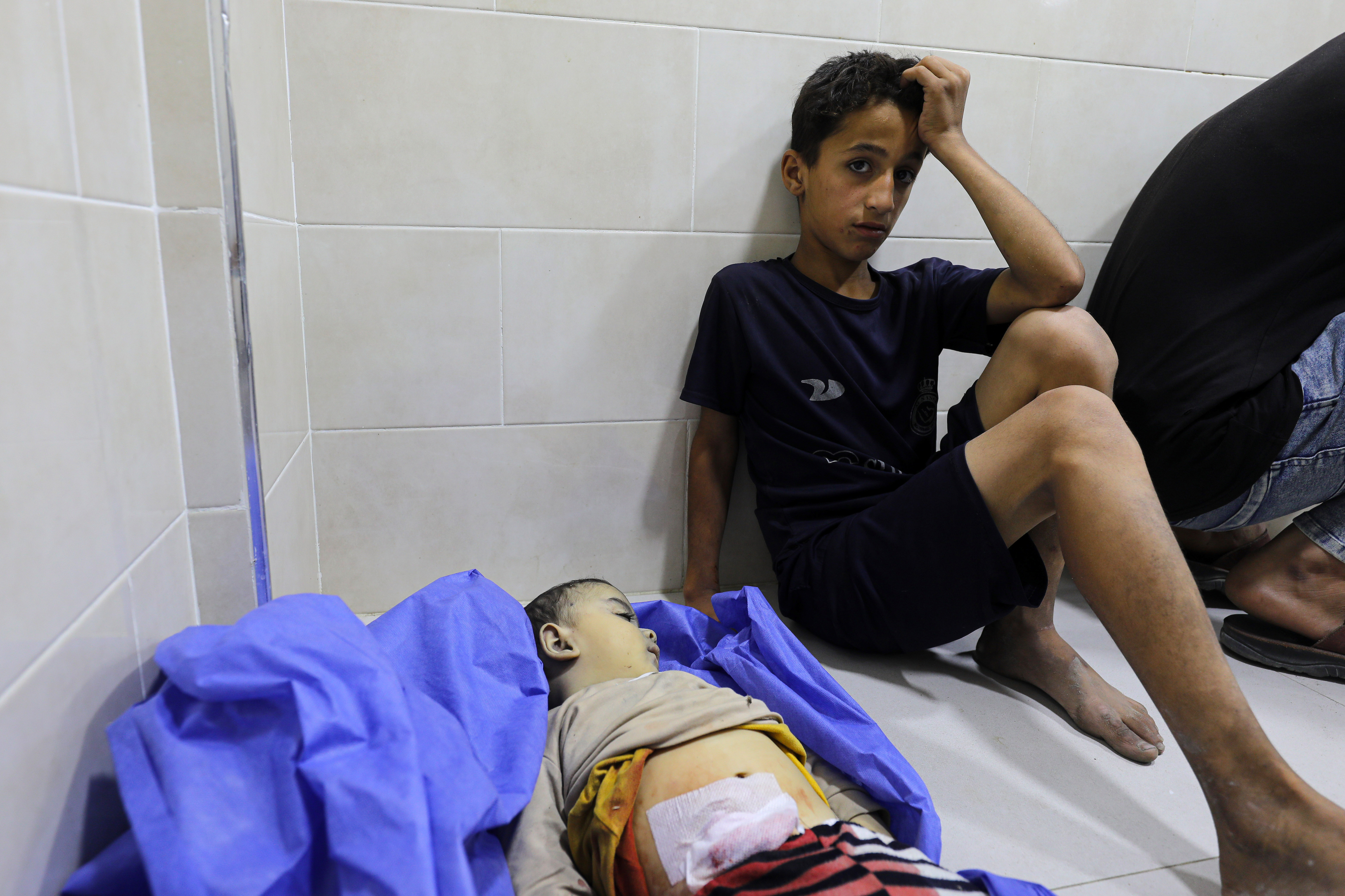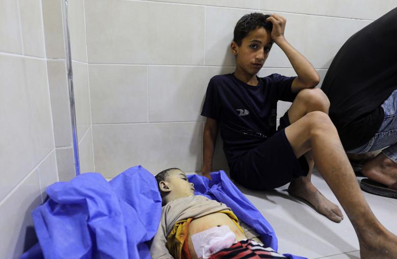 فلسطينيون ينقلون الجرحى والمفقودين إلى مستشفى العودة بالنصيرات بعد غارة جوية على مخيم النصيرات للاجئين.